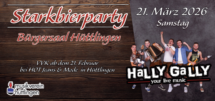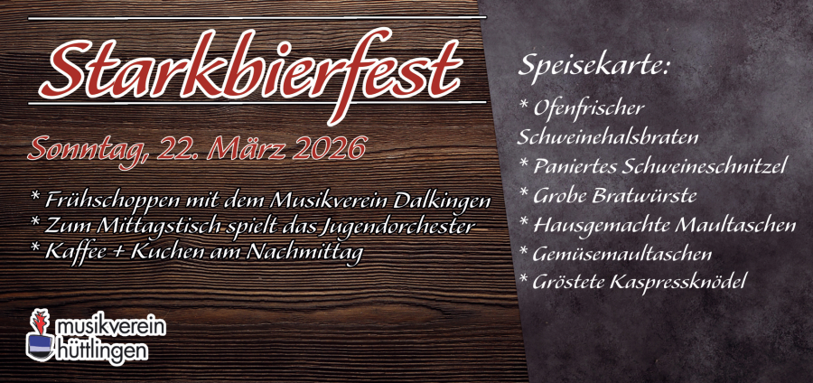 Es ist wieder soweit: Unser legendäres Starkbierfest in Hüttlingen steht vor der Tür. Freut euch auf einen geselligen Abend mit frischem Fassbier, bester Stimmung und zünftiger Atmospähre.